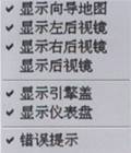 功能选择菜单如图所示,该菜单项是用于选择驾驶时在屏幕上显示的信息,包括向导地图、左后视镜、右后视镜、后视镜、引擎盖、仪表盘、错误提示等。“√”为选中状态,默认状态为全部选中,驾驶者也可应根据自己的习惯及爱好选取。