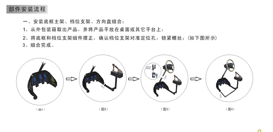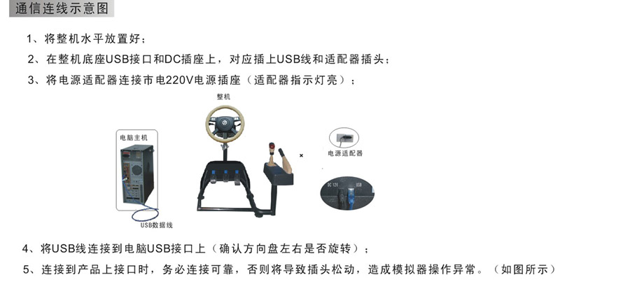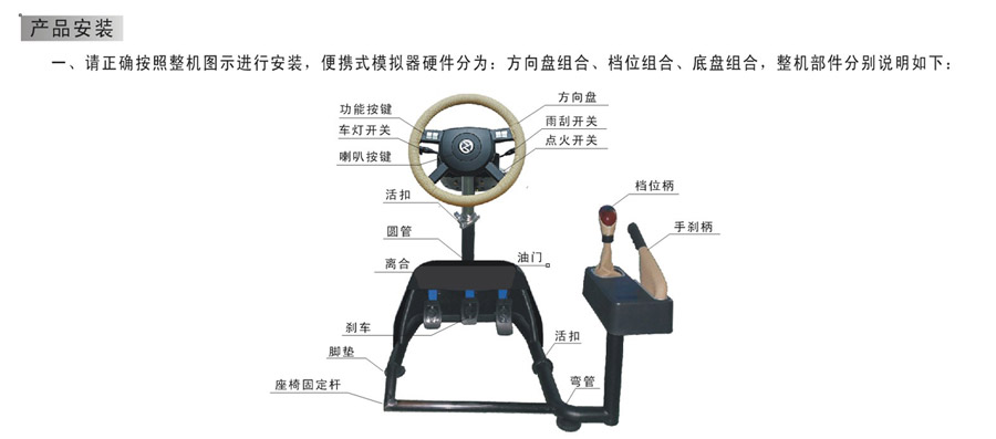 2.2结构描述: 舒适型汽车驾驶模拟器的方向盘、档位等结构与真车尺寸一致,其中主要部件使用真车配件,方向盘、油门、离合器、刹车、档位、操作方法与真车一致,每个功能信号通过数据采集,同步传感方式传给主控制系统软件,并通过相应的仿真装置,实现力反馈和位移的模拟,学员操作时有与真车驾驶基本相同的感觉,可自主选择行车模式、车辆类型、气候状况、及不同场景。同时配有学员操作状态显示和语音提示,让初学者更好地体验学车的真实感受! 2.3各部件名称: 2.4安装简单,通信连接 1) 安装流程: 2) 通信连接: 三、产品应用 (一)车灵通系列主要应用于驾训学校: 1、满足学员的需求 驾培市场是一个逐年递增发展的行业,学员越来越多,练车的时间也相应减少,车灵通可以让学员在轻松的环境下练车,专业的配置同样可以快速提高驾驶技术和专业知识。 2、驾培教练好帮手 车灵通仿真度极高的场景模拟、声音配置,完全可以代替真车上路,一方面减轻了教练的教学强度,尤其是对领悟能力较慢的学员的教学强度,另一方面能有效减少新学员的交通意外,安全系数高。 3、提高驾校经济效益 高科技产品的引进,从某种程度上提高了驾校的声誉,壮大驾校的实力,最重要的是,投入车灵通将大大缩小场地、车辆等各种成本,减少汽车磨损、燃油等费用,从而提高效益。 (二)用于网吧:利用网吧现有电脑硬件和客户资源,部分电脑配备汽车模拟器'>汽车模拟器可提高网吧的收费和人气。