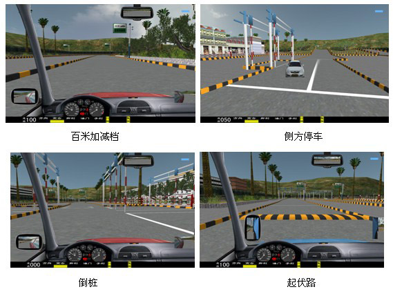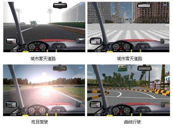 (一)软件功能: 1、主视屏:显示驾驶前方道路与周围路况、使学生能感觉身在驾驶室操作着运行中的汽车。并显示档位、成绩分数。 2、后视镜:能达到与真车相同的模拟效果。可升降。 3、模拟仪表:显示车速、里程、发动机转速。并且可自行决定关闭或开启。 4、特殊功能:通过鼠标操作可由正常驾驶室驾驶模式切换到六种不同府视式驾驶模拟。 5、训练场景科目:⑴ 一般道路; ⑵ 高速公路; ⑶ 城市道路;(包括:行人、自行车、其它车辆、双黄线、岗亭、警察、红绿灯、转盘、交通标志标线等。) (4)炫目道路 (5)泥泞道路 (6)山区道路; (7)曲线穿桩、场地倒库; (8)“ 8 ”字型路; (9)直角弯路、十字路口、丁字路口、匝道等。 (10) 蛇形路; (11)就位停车; (12)顺行停车; (13)双边桥; (14)单边桥; (15)单凸桥; (16)横断桥; (17)骑越障碍; (18)立交桥; (19)隧道。 6、天气: 一般道路可选择四种天气:白天、雪天、雾天、雨天、黑夜。 7、画面选择:可以选择“打开”或“关闭”:后视镜、向导地图、错误提示、成绩等。 8、其它车辆选择:各道路分 6 种数目选择:3 至 60 辆。 9、车型选择:在训练中有六种车型 小轿车、吉普车、无级变速车(自动档)、大货车、大客车、农用车等。10、汽车模拟技术:汽车多自由度数学模型,实现汽车转向、制动和加速的逼真模拟。 11、测试调整功能:传感器测试:方向机的测试、离合器的测试、油门的测试、制动器的测试(脚刹)、手制动的测试、变速器各档位的测试、鸣号、点火、开锁。只要打开测试界面便一目了然。
