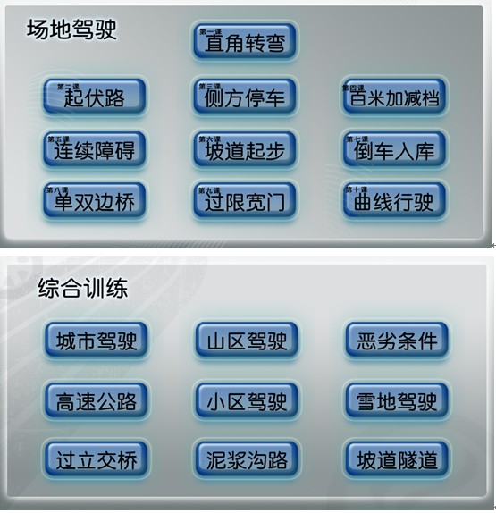 软件界面 软件采用三维地形模块,利用计算机三维虚拟仿真技术,产生逼真的三维立体的道路驾驶场景,系统采用图形运算加速和高速显示系统,具有很强的身临其境的感觉,可以根据教学任务选择不同的系统地形。包括各种天气状况;各种交通地形,如立交桥、涵洞、十字路口、坡道等;多种情况下驾驶、会车、跟车、碰撞等情况 性强、性价比高等特点。