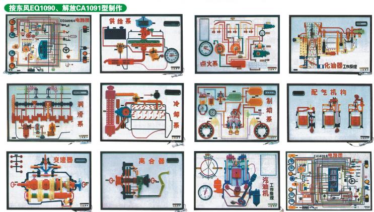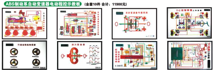 | 汽车程控电教板 简介: 本品采用铝合金框架,表面采用彩色有机玻璃压模成型,程控教鞭控制,转动式字幕显示。规格:1200*800*mm;电源:12V直流电源。 使用方法: 将板面电线接在电源箱的12V直流电源上(红色为+级)将教鞭插入孔内(电源指示灯亮),按下教鞭上按钮开关即可演示。 结构特点: 1、电动程序控制电路; 2、每块电教板的板面一侧都有屏幕显示; 3、板面机械部分采用半立体彩色有机玻璃用模具一次成型铸成; 4、可自动控制每块电教板工作原理的演示,彩灯逐点闪烁显示各系统的油路、电路、水路、气压等工作原理,可快慢调节,演示时机械部分、灯光部分、仪表部分都同步工作。全透明光电演示东风EQ140型汽车教学模型(东风EQ1090) ![]() ABS制动系统、TC系统、空调系统自动变速器电动程控示教板