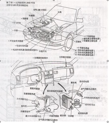 一般汽车空调系统可分为普通空调系统与全自动空调系统两种,通常的普通空调是通过人工手动设定风机转速、出风方式和出风温度后,空调系统不能自动根据车内、外环境温度与光照强度的变化而调整工作状态。而自动空调系统主要特点是通过若干个温度及光照等传感器来测量环境的温度及光照的变化的信号,微机控制系统内事先设定好的程序自动进行制冷及取暖、送风方式、压缩机状态及内外气热循环的变化。从而使车内的环境温度及空气质量达到最佳的状态。最先进的汽车空调系统还可以根据车内不同乘客的不同要求,在车厢内部营造出适合每个人不同的温区。微机控制全自动空调系统一般都有故障诊断系统。 2、全自动空调系统的主要组成部分 本书全自动汽车空调系统采用的是凌志LS-400轿车上的汽车空调系统。凌志LS-400轿车属于日本丰田公司的高级车型,此空调系统基本具备了全自动空调系统的所有功能。全自动空调系统从功能上来分主要可分为:制冷系统、取暖系统和空调电控系统。 凌志LS—400汽车制冷系统主要由压缩机、冷凝器、干燥贮液器(容器)、膨胀阀、蒸发器、输液(气)软管以及风扇(电动冷却风扇、送风机马达)等组成。其中,蒸发器、送风马达、膨胀阀、蒸发器温度传感器以及送风机电阻等组成冷却和送风机组件,位于汽车仪表板下方;压缩机、电动冷却风扇和冷凝器、干燥贮液器(容器)等位于汽车发动机舱内(如图1所示)。