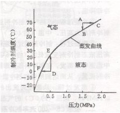 图1 凌志LS-400空调系统结构位置图 凌志LS—400汽车取暖系统主要由加热器芯、冷却水控制阀、加热器鼓风机及发动机冷却系统组成。 凌志LS—400汽车空调电控系统主要由传感器、空调ECU和执行器组成。 二、空调制冷系统的工作原理及各组成部分的作用 汽车冷气系统的工作原理与家用空调原理基本相似。实现制冷效应,必须采用一种可使周围气温下降的物质,称制冷剂。汽车制冷系统现多采用氟里昂12(R—12或F12),R—12主要特性为: (1) 0.1Mpa大气压下—29.8℃开始蒸发。 (2)在5℃、0.3Mpa压力下呈液态,冰结温度为—158℃。 (3)无色、无毒、无刺激性,常温下无变化,不爆炸,不侵蚀金属和橡胶件,适合小型冷气机使用。 (4) 明火时即产生有毒性的光气,在车内空气中氟里昂浓度达28.5%~30%时会引起人体缺氧而窒息。 制冷剂R—12在不同压力与温度下的冷凝、气化曲线如图2所示,曲线上部表示R—12处于气态,下部表示处于液态,曲线本身则表示R—12在不同压力下的沸点。