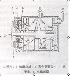 图2 制冷剂的压力-温度变化状态图 液态的R—12如在一定温度下降低压力,就会蒸发成气体。在这气化过程中需要从周围空气中吸取一定热量,使周围气温下降而实现制冷效应。制冷循环过程如图所示。 基本的制冷系统由制冷剂和四大机件:压缩机、冷凝器、膨胀阀、蒸发器所组成。制冷循环工作原理是这样的:低温低压的液态制冷剂流入蒸发器,从车厢空气中夺走蒸发所需的热量(车厢内空气因此而冷却),流出蒸发器时,制冷剂因吸热而由液态气化成低温低压的气态。压缩机吸入低温低压的气态制冷剂后,将其压缩成高温高压气态制冷液,流入冷凝器散热冷凝成中温高压液态制冷液,再流入膨胀阀,经膨胀阀膨胀减压后,又变为低温低压的液压制冷剂,重新回到蒸发器入口,完成了制冷剂由液态吸热气化成气态,又由气态放热冷凝成液态的工作循环。 由此可见,制冷循环应包括以下四个变化过程。 压缩过程:压缩机将蒸发器出口处的低温(约0℃)、低压(约0.15Mpa)的气态制冷剂增压为高温(70~80℃)、高压(1.5MPa左右)的气态过热制冷剂,流入冷凝器冷却降温。 冷凝过程:过热气态制冷剂进入冷凝器散热冷凝为液态制冷剂。冷凝过程的后期,制冷剂成为高压、中温(约40℃)的制冷液体。 膨胀过程:制冷剂通过膨胀阀后,体积变大,其压力和温度急剧下降,则使中温高压液态制冷剂变成低温(约—5℃)、低压(约0.15MPa)的湿蒸气,以便进入蒸发器中迅速吸热蒸发。在制冷剂蒸发膨胀过程中进行节流控制,供给与制冷负荷相适应的制冷剂流量,从而达到所需的制冷温度。 蒸发过程:从膨胀阀流出的制冷剂,通过蒸发器不断吸热气化变成低压(约0.15MPa)、低温(约0℃)的气态制冷剂,吸收车厢中的热量。 要实现以上的制冷过程主要是通过以下的主要部件的工作实现,以下介绍这些部件的作用: 1、压缩机 压缩机是对气态制冷剂进行加压的加压泵,它是制冷系统的心脏。压缩机使制冷剂在制冷系统中产生循环。它的主要工作机理为通过活塞在气缸中上下运动,改变压缩机室内气态制冷剂的体积,达到增压目的。 2、电磁离合器 电磁离合器一般位于压缩机轴毂总成上,有旋转线圈式与固定线圈式两种。旋转线圈式电磁离合器在压缩机运转时,电磁线圈与皮带轮一起旋转,线圈的两个端子各自焊在两个铜环上,通过两个碳刷输入励磁电流;固定线圈式电磁离合器结构如图3所示。